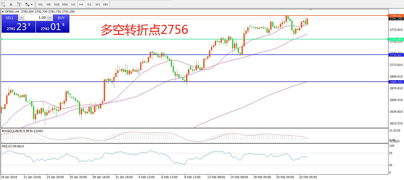 4小时图看,SP500高位震荡后呈现明显的上升趋势状态,21均线成为下方短线支撑,MACD红柱缩短,短期有回调风险,但整体依然维持多头思路。