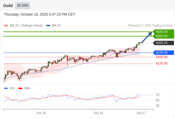 在 4225.00 之上,看涨,目标价位为 4300.00 ,然后为 4320.00 。