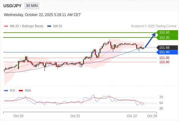 在 151.40 之上,看涨,目标价位为 152.30 ,然后为 152.60 。