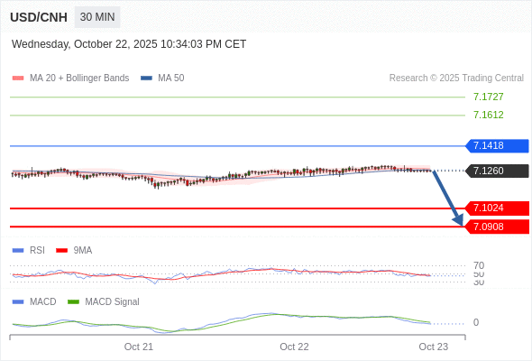 备选策略: 向上突破 7.1418 ,将带来继续上行的趋势,目标位定在 7.1612 和 7.1727 。