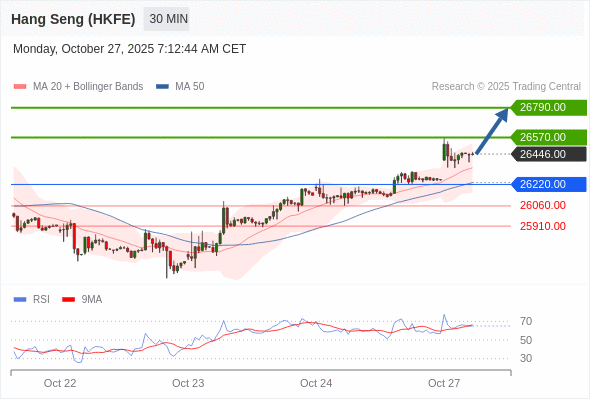 在 26220.00 之上,看涨,目标价位为 26570.00 ,然后为 26790.00 。