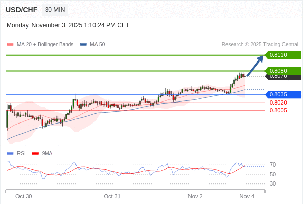在 0.8035 之上,看涨,目标价位为 0.8080 ,然后为 0.8110 。