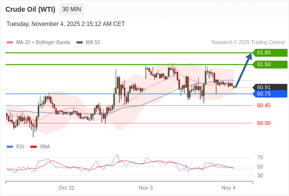 在 60.75 之上,看涨,目标价位为 61.50 ,然后为 61.80 。