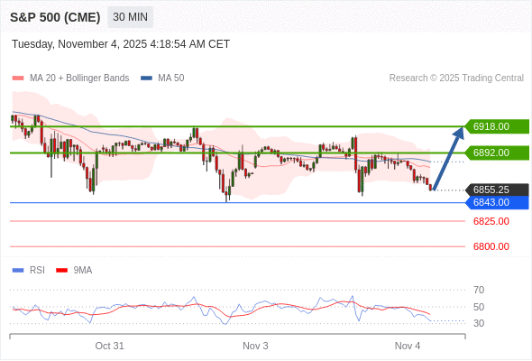 在 6843.00 之上,看涨,目标价位为 6892.00 ,然后为 6918.00 。