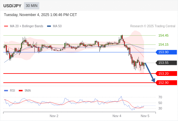 在 153.90 之下,看跌,目标价位为 153.20 ,然后为 152.90 。