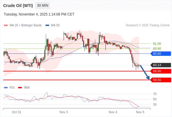 在 60.60 之下,看跌,目标价位为 59.90 ,然后为 59.55 。