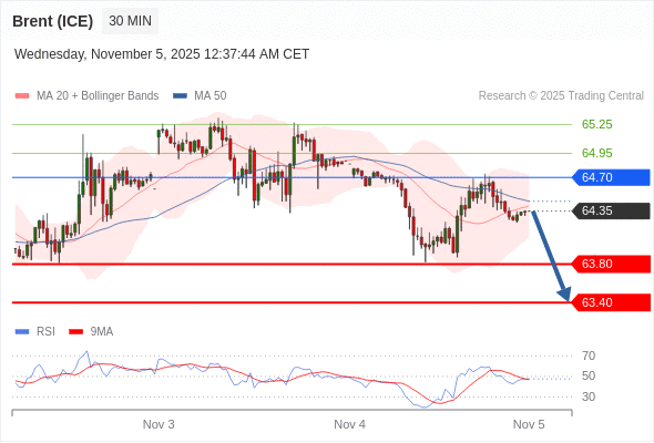 交易策略: 在 64.70 之下,看跌,目标价位为 63.80 ,然后为 63.40 。