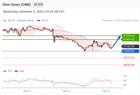 美国道琼斯指数期货 (Z5) 当日内: 超短线(当日内)支撑位在47000.00附近。