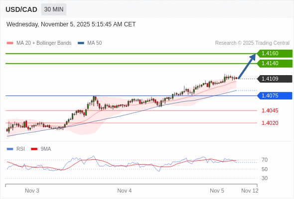 在 1.4075 之上,看涨,目标价位为 1.4140 ,然后为 1.4160 。