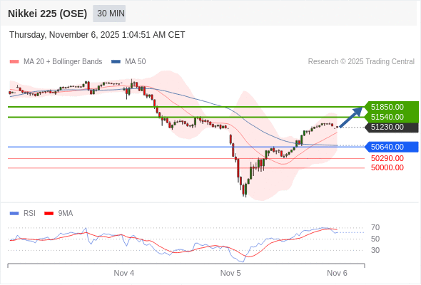 日经225股指期货 (OSE) 当日内: 在50640.00之上,看涨。