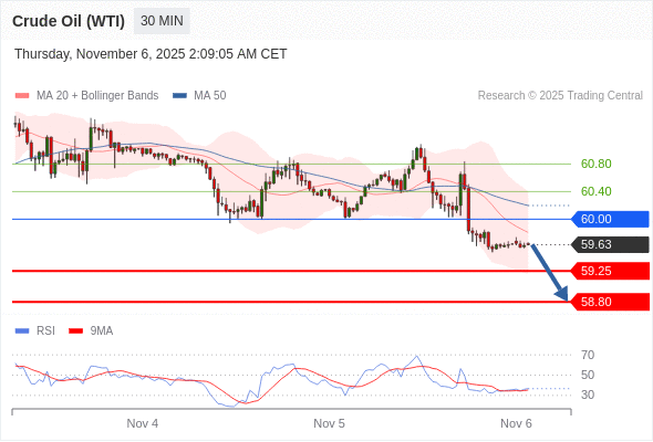在 60.00 之下,看跌,目标价位为 59.25 ,然后为 58.80 。