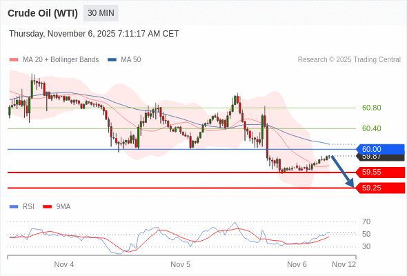 在 60.00 之下,看跌,目标价位为 59.55 ,然后为 59.25 。