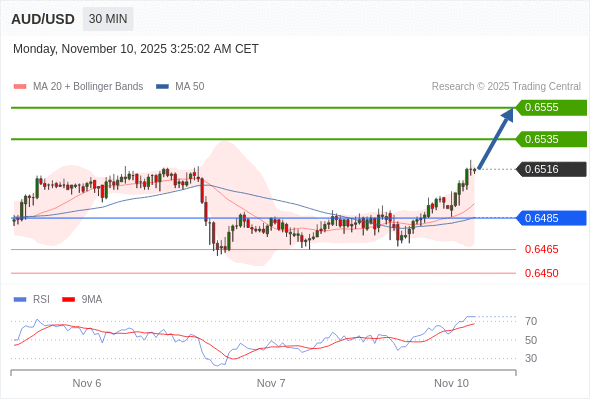 在 0.6485 之上,看涨,目标价位为 0.6535 ,然后为 0.6555 。