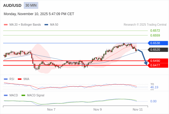 澳元/美元 当日内 : 逐渐下跌,当 0.6538 阻碍上行,则 0.6477 为目标位。