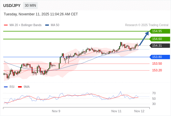 在 153.80 之上,看涨,目标价位为 154.60 ,然后为 154.95 。