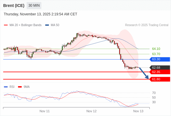 在 63.30 之下,看跌,目标价位为 62.35 ,然后为 61.80 。