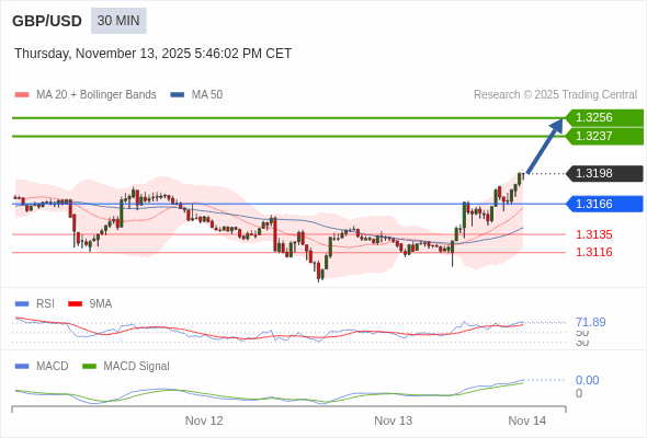 英镑/美元 当日内 : 看涨,当 1.3166 为支撑位。