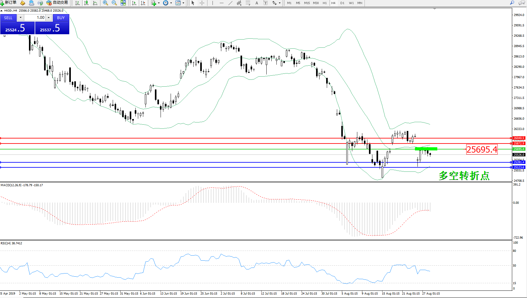 香港恒生指数828日(周三)收盘下跌48.59点,跌幅0.19%,报25615.48点;恒指26000附近压制极大,沽盘再度涌出。恒指回落再倒跌,续在低位横行。外围市场多个风险因素叠加,加上债息倒挂等因素令市场忧虑全球经济衰退,美股及港股已经反弹乏力。内外夹击下,若没有实质性的利好消息,相信港股仍将维持震荡格局。