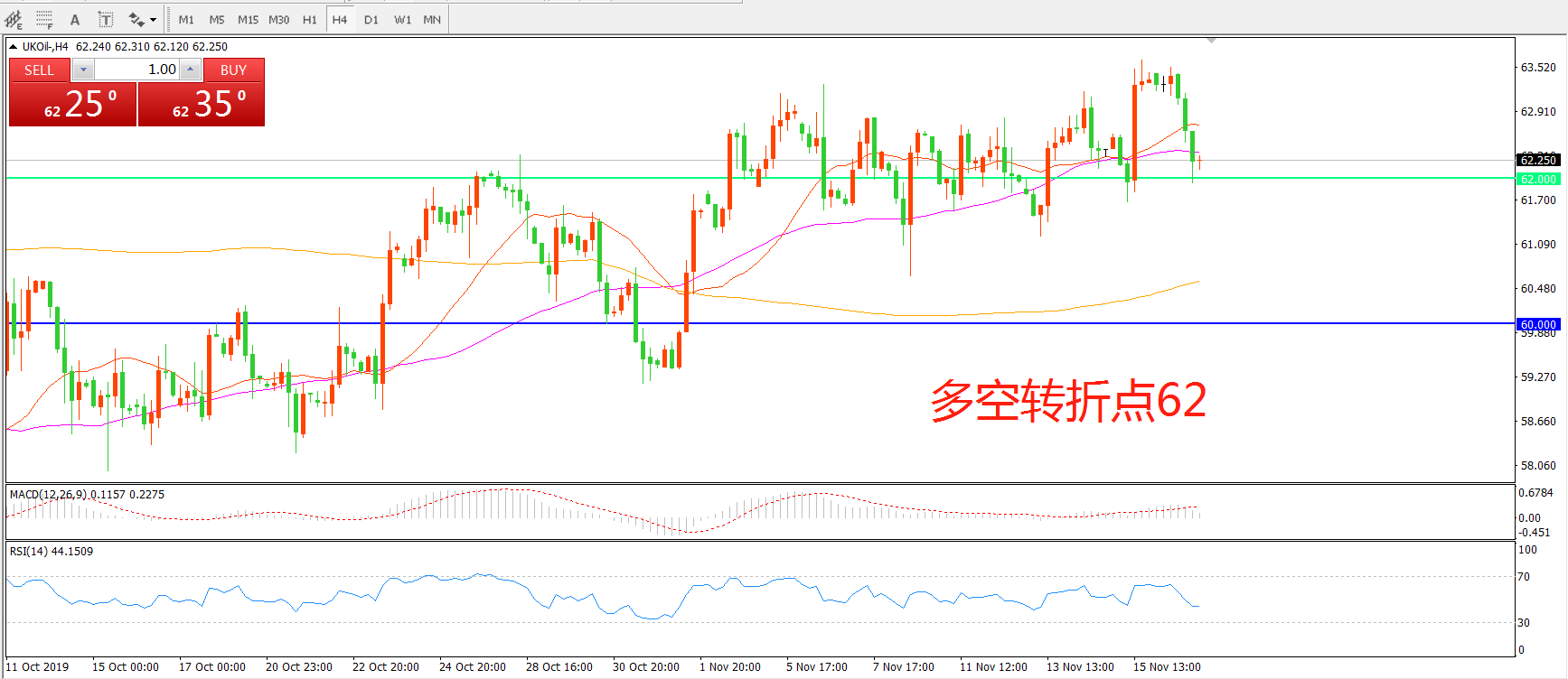 4小时图看,油价延续高位震荡走势,62美金成为短期价格支撑,MACD红柱减少,RSI指标走平,油价延续震荡的概率较大。