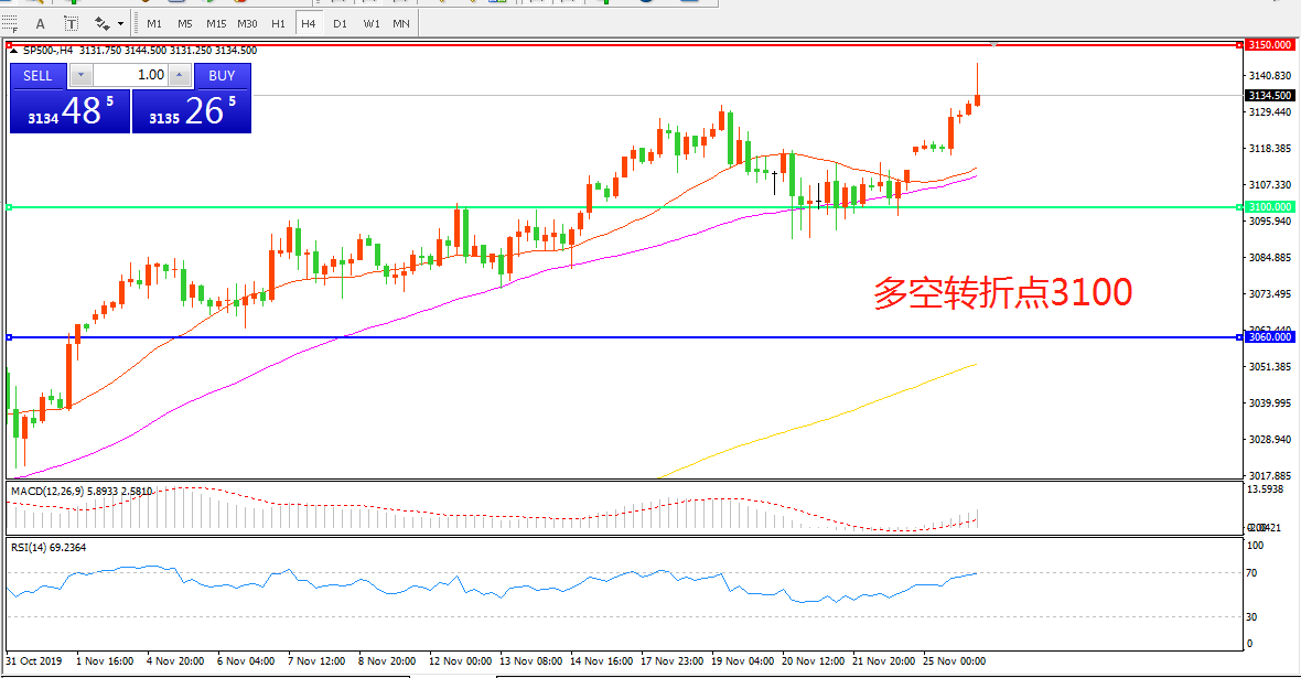 周二(11月26日),美联储主席鲍威尔在维登斯商会的年会上发表讲话称,假如经济保持在当前轨道,那么当前货币政策可能依然适宜。这份措辞与其近期言论形成呼应,这让金融市场更多的被乐观情绪所笼罩,标普500昨日震荡反弹,收报3121点。芯片类股普涨,英伟达涨超4%,热门中概股多数上涨,拼多多、瑞幸咖啡涨超7%。