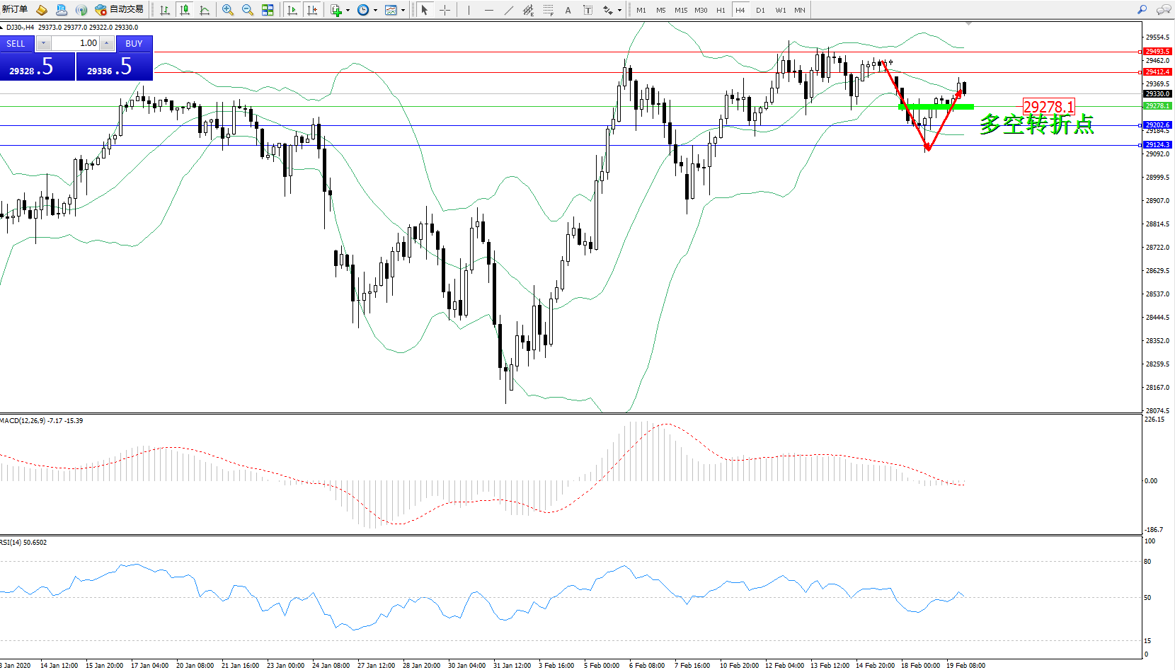 交易策略:29278上方看涨,目标29412、29493