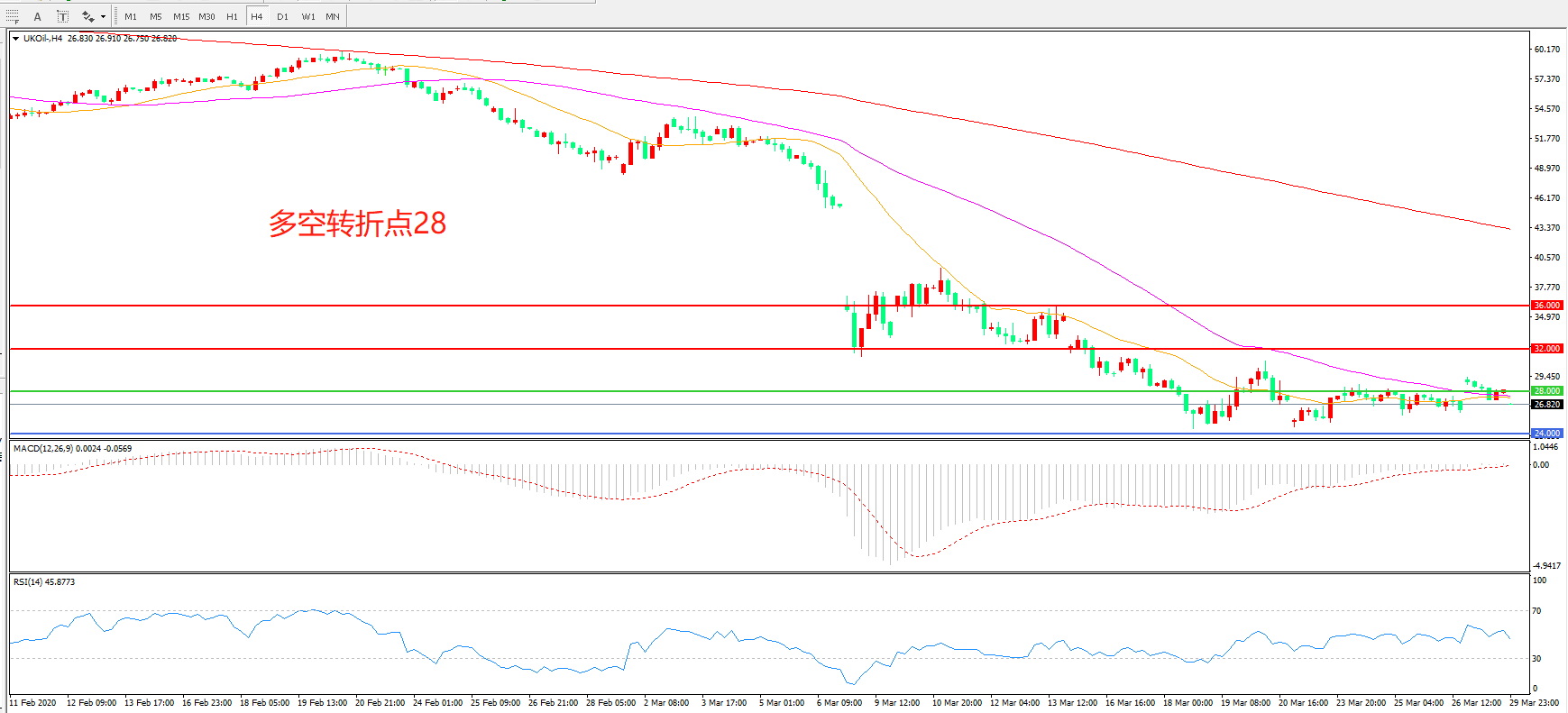 4小时图看,布油延续低位震荡,整体波幅不大,28美元成为短期多空分水岭,55周期均线逐渐下压,MACD绿柱减少,RSI指标走平,日内延续震荡概率较大。