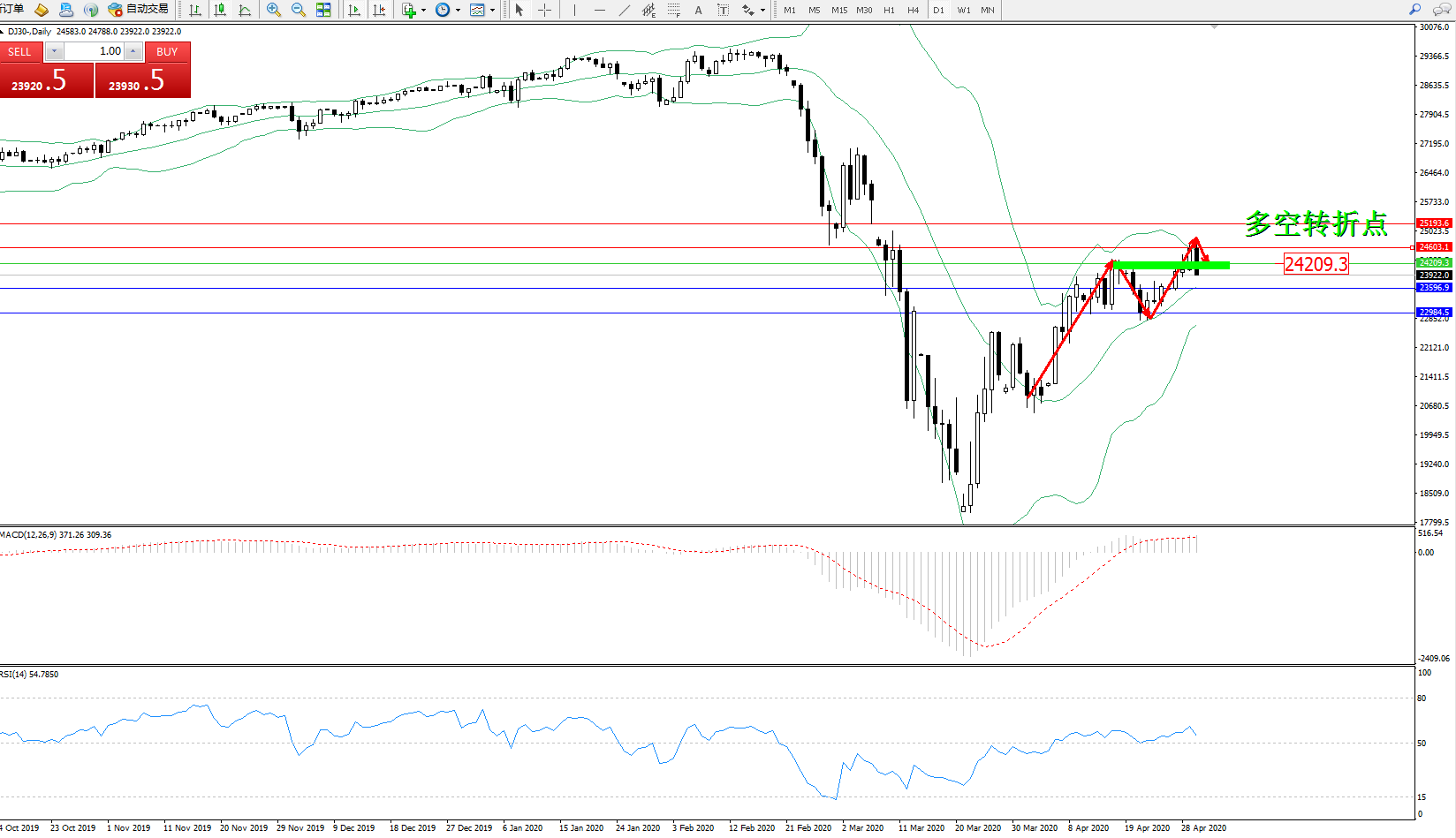 道琼斯指数4月30日(周四)收盘下跌288.10点,跌幅1.17%,报24345.72点。美国股市下挫,严峻的经济预警、疫情影响下糟糕的数据和企业业绩令股市承压,给二十余年来最佳月度表现划上了一个不太圆满的句号。此前美国公布的首次申请失业救济金人数大于预期。成分股中,下跌和上涨股的数量之比约为4比1;微软、Facebook、特斯拉的强劲业绩部分遏制了纳斯达克指数的跌势。市场猜测新冠疫情对经济的损害可能是短暂的。大型企业企业的强劲业绩令人感到鼓舞,但挑战依然存在。预计在可预见的将来,市场还会出现一番拉锯。