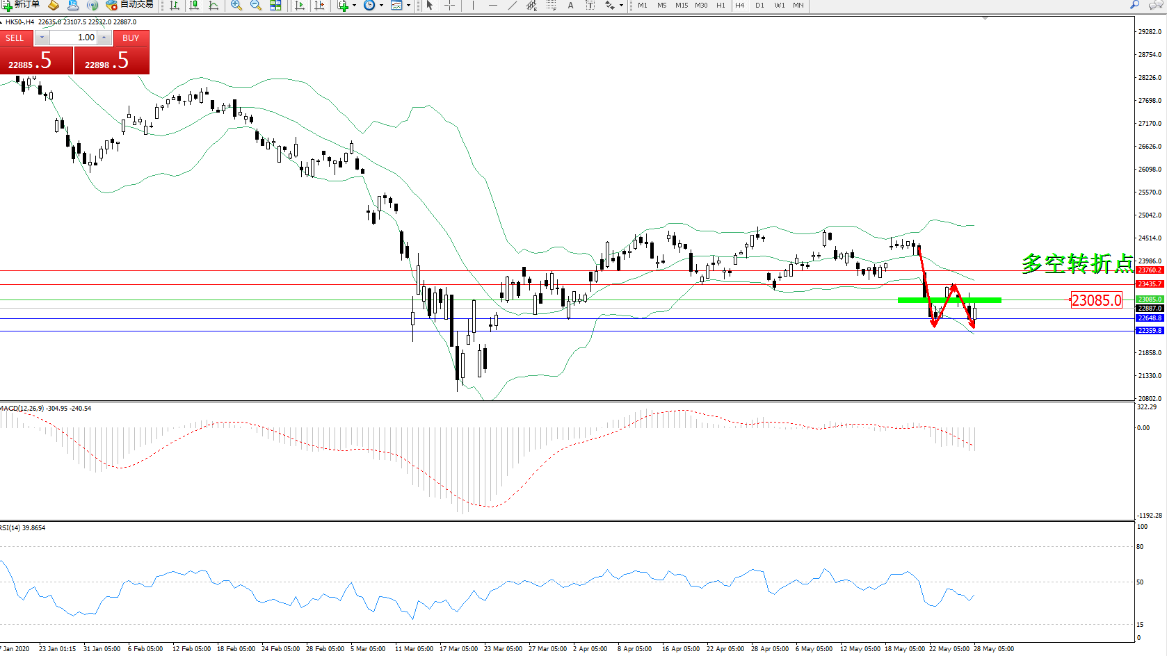 香港恒生指数5月28日(周四)收盘下跌168.60点,跌幅0.72%,报23132.76点;港股市场疲弱,恒指盘中一度跌超2%,南下资金净流出3.2亿港元,大市成交额为1326.99亿港元。煤炭股、黄金股逆势走强,中国神华涨超2%;网传第三轮带量采购最快7月启动,医药股全线下挫,石药集团大跌超10%领衔下跌;半导体、生物科技、软件股跌幅居前。港股仍然缺乏方向,但在负利率环境下,避险股仍首选内银股。眼下的这场新冠疫情已经造成了损失,各国刺激计划将是关键所在;在全球经济存在巨大不确定性之际,2020年吸引海外投资的竞争将更加激烈。