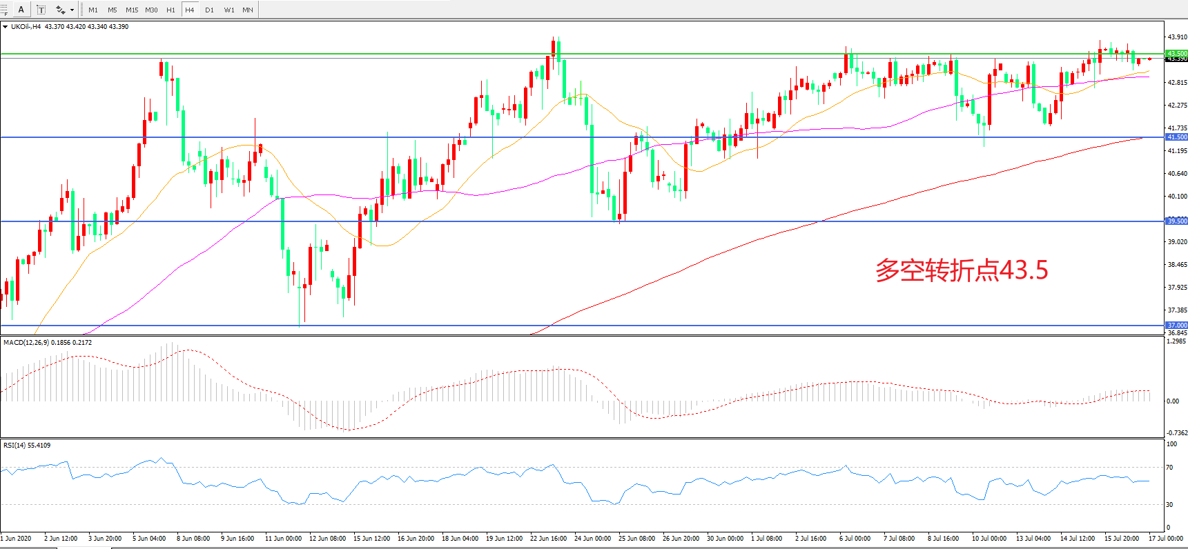 4小时图看,油价延续高位震荡,43.5美元成为短期争夺焦点,均线系统走平,MACD红柱增加,RSI指标走平,日内延续上行概率较大。