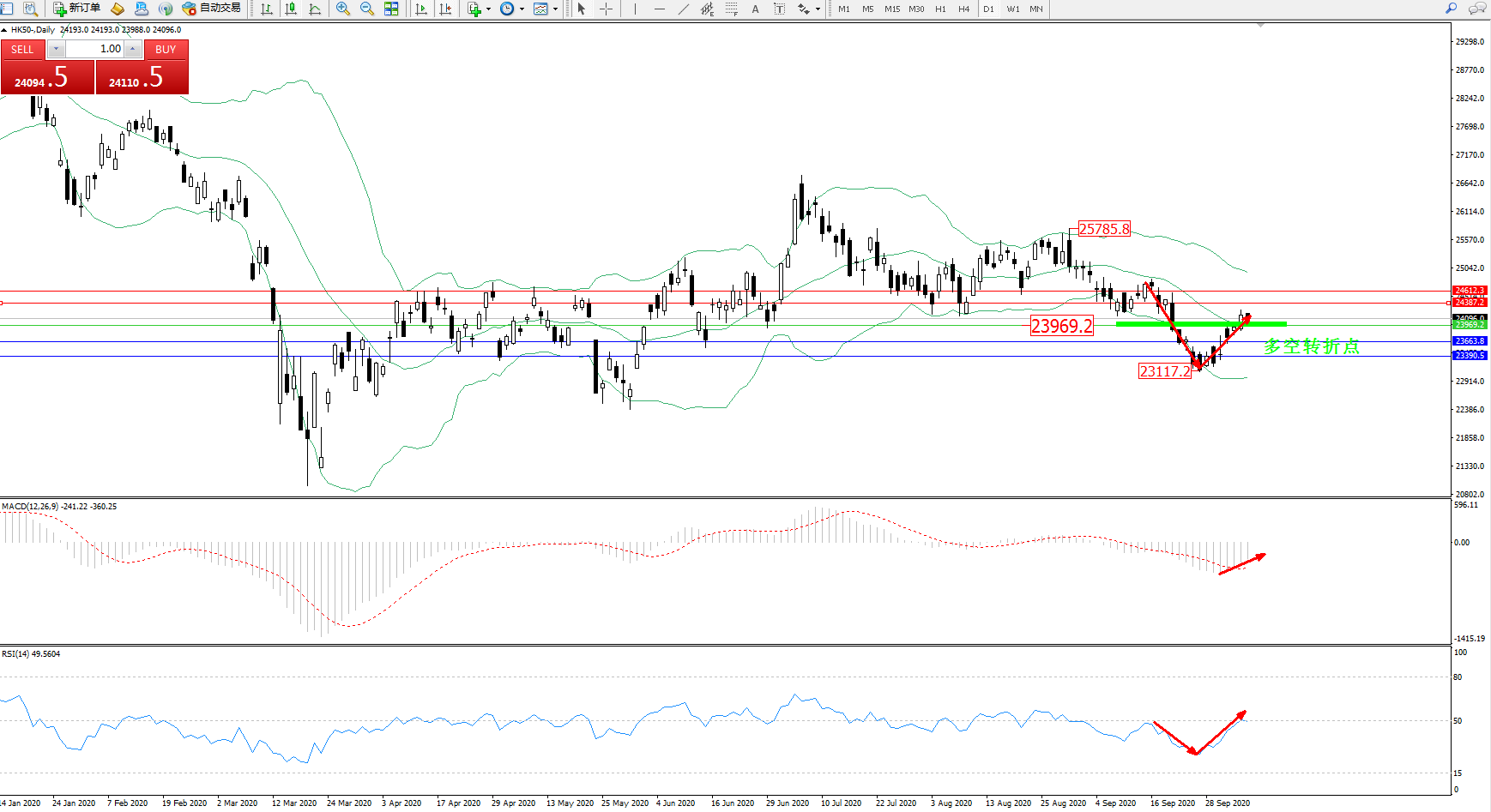 技术点评:空头动力延续布林带指标下轨弱势不断下探,低位抵达23117附近后得到支撑开始整理回升,布林带指标呈收口走势持续下行后开始有走平态势,低位反转回升至中轨上方后弱势整理,突破中轨有继续回升态势,MACD指标处于空头区域低位整理缓慢回升中,RSI指标处于空头区域持续震荡下行后得到支撑开始反转上移,触及50均衡线附近徘徊中;