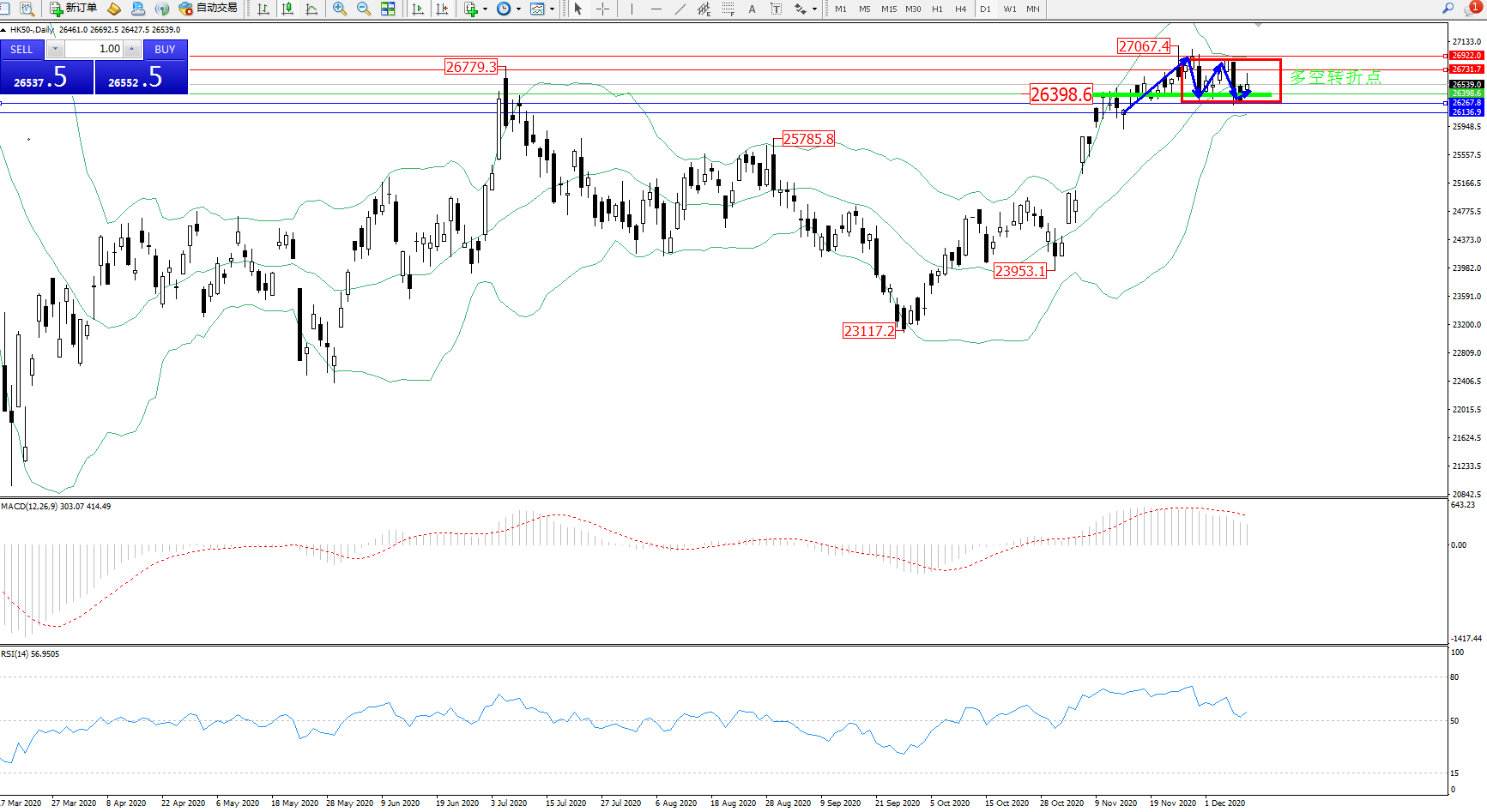 香港恒生指数12月9日(周三)收盘上涨198.28点,涨幅0.75%,报26502.84点;港股恒指全天高位震荡,午后略有回落,恒生科技指数涨0.21%,尾盘一度转跌。大型科技股小米升超4%逼近新高价,阿里、网易、腾讯皆有涨幅;光伏、半导体全日走弱,尾盘跌幅进一步扩大,保利协鑫能源收跌14.68%;石油股全线下跌,中海油跌2.6%。今日南下资金净流入15.41亿港元,大市成交额为1366.1亿港元。花旗发表报告表示,在新冠疫苗即将面世、政局趋平静及环球复苏下,预期2021至2022年香港经济会逐步复苏,料明年上半年的恢复由内地经济及旅游气泡所带动,而明年下半年则由疫苗带动真正旅行恢复及促进服务业的发展。该行上修香港今年实质GDP预测,由收缩6.3%上修至收缩5.8%,同时将明年预测由回升2.8%上调至升3.5%。