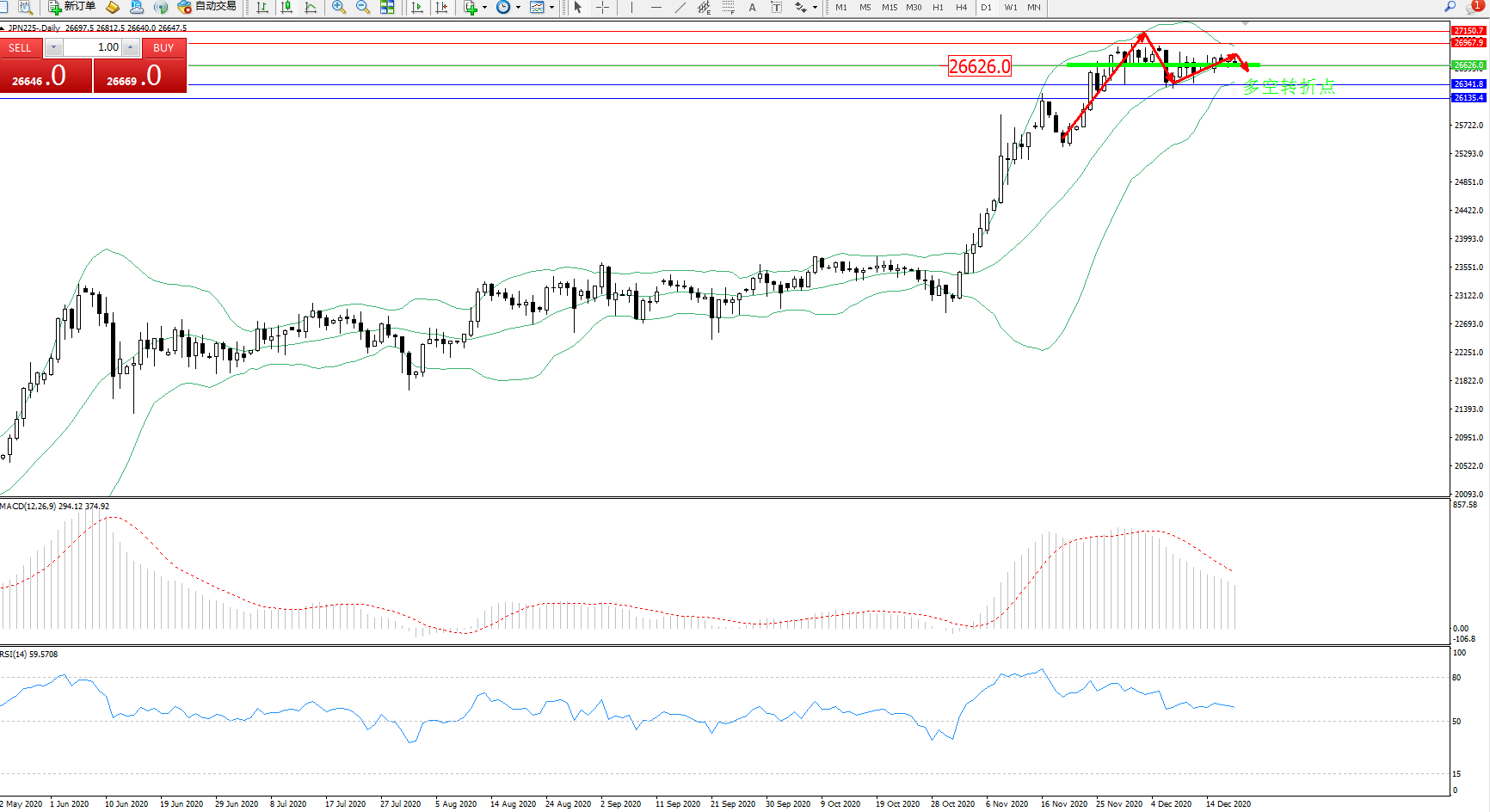 日经225指数12月18日(周五)收盘下跌38.17点,跌幅0.14%,报26768.50点。日本东京周五新增新冠肺炎确诊病例664例。日本央行维持基准利率不变。虽然汇价相比隔夜录得的逾9个月低位已经有所反弹,但总体走势仍然疲弱,在美国财政谈判风险仍然巨大,日内早间日本CPI数据显示通缩压力进一步加大,这可能引发日银官员的关注,日本首相菅义伟:经济能在下一财年恢复疫情前水平,是基于政府预计下财年能实现约4%的实际GDP增长。日本政府最高经济委员会私营部门成员:日本政府应继续实施灵活的宏观经济管理。加强资本市场,公司治理对促进私营部门驱动的经济增长至关重要。呼吁政府制定长年的目标,推进监管改革,在数字和环境友好型增长领域进行投资。呼吁政府制定、改革公私部门的数据使用规则。