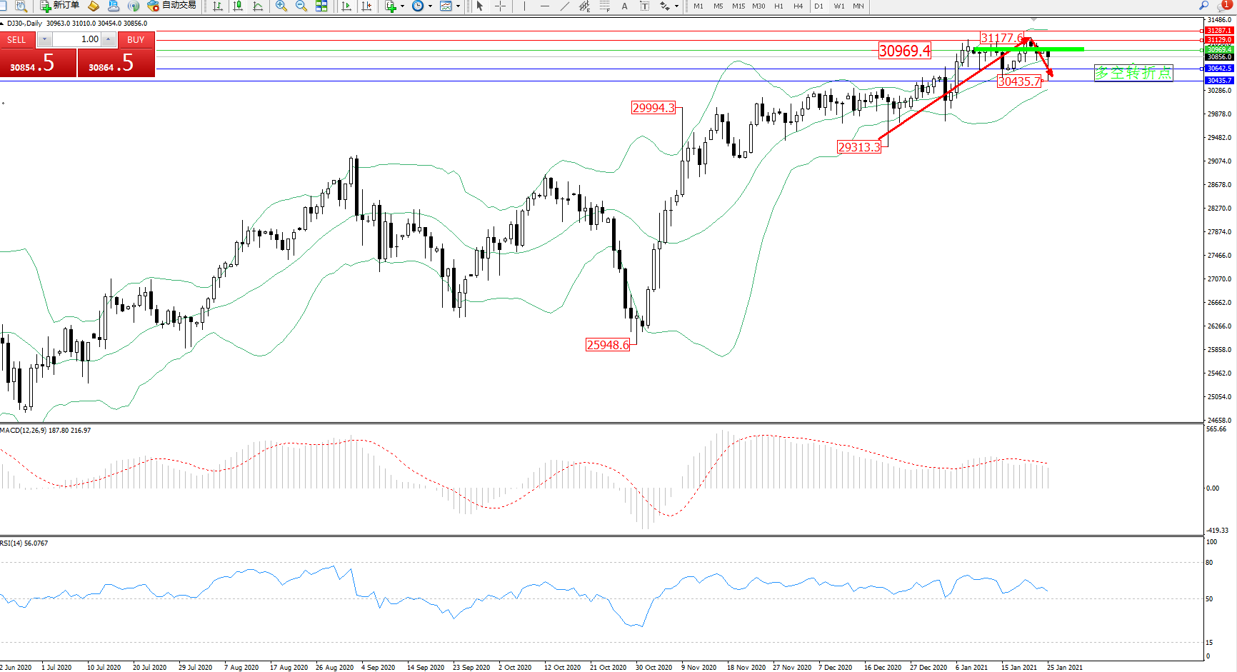 技术点评:多头动力延续布林带指标通道中上轨区间持续震荡上扬至31177位置后遇阻开始震荡回撤下行,然多头动力短暂快速下挫后急速回升至中轨附近节点,布林带指标呈收口走势中,关注中轨上方附近节点,MACD指标处于多头区域维持整理平移中,RSI指标处于50均衡线上方窄幅震荡后弱势徘徊中;