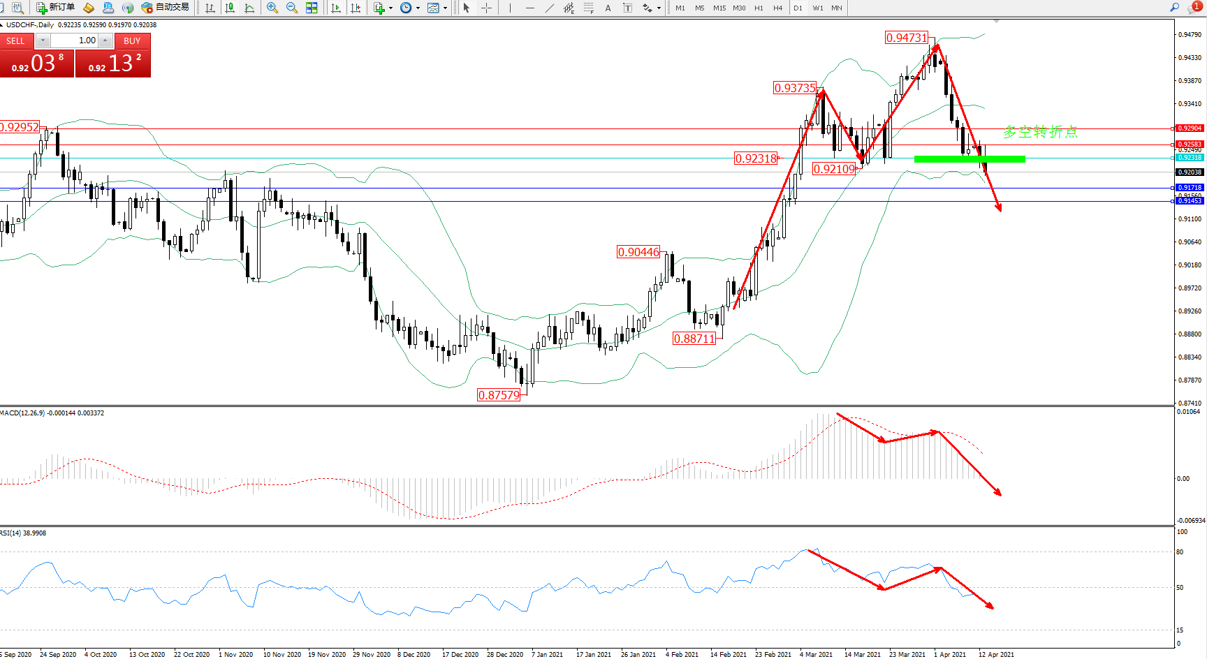 备选策略:0.92318上方看涨,目标0.92583、0.92904