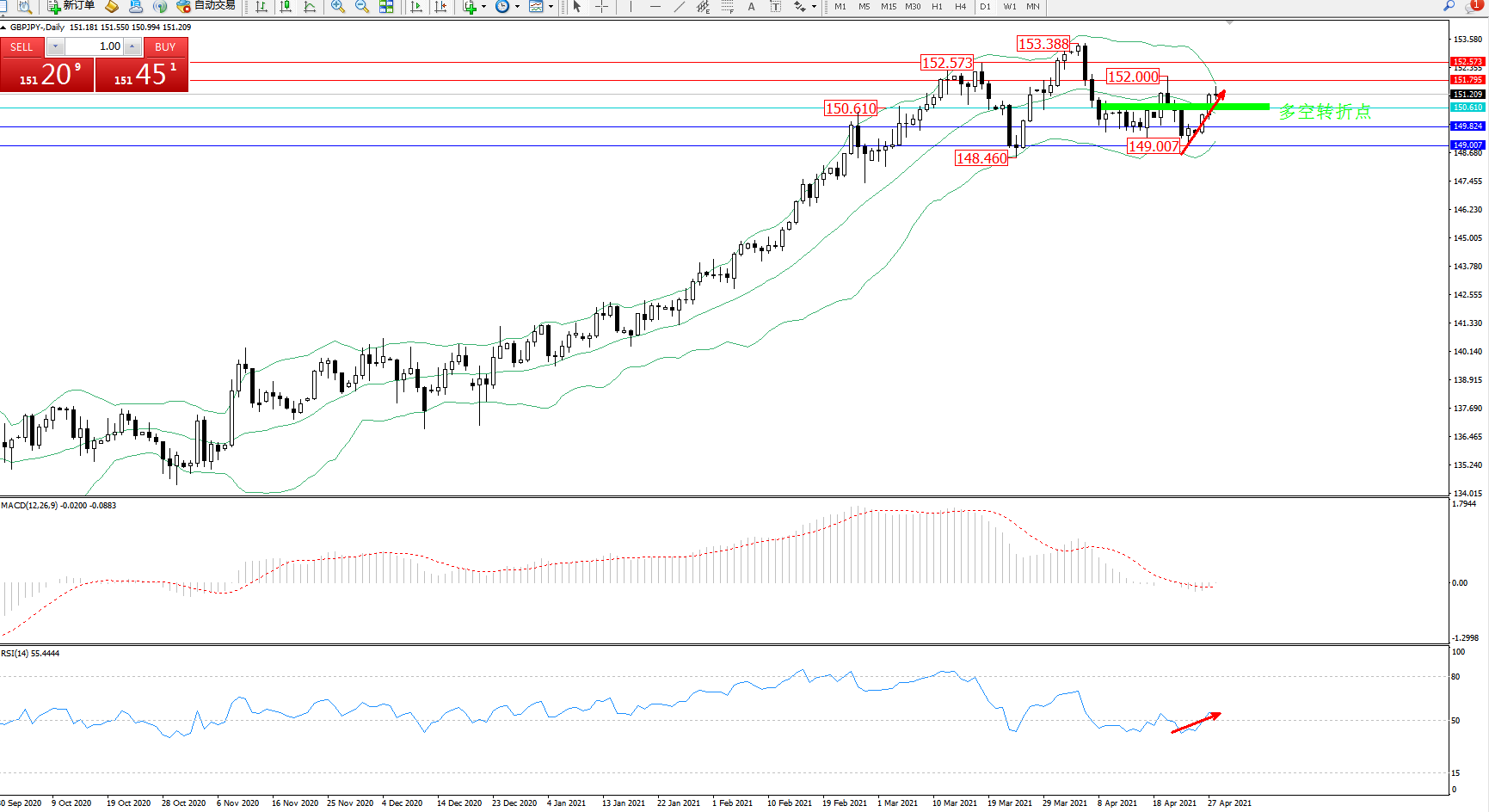 技术点评:多头动力延续布林带指标通道持续震荡上扬,高位触及153.388位置后震荡回撤下行,纠结于中下轨区间弱势整理平移,抵达149.007位置后多头动力震荡回升,突破中轨进入中上轨区间震荡,即将触及上轨附近节点,布林带指标呈收口走势中,MACD指标高位空头动力震荡下行至0轴线附近节点开始徘徊,RSI指标纠结于50均衡线下方弱势整理后回升;