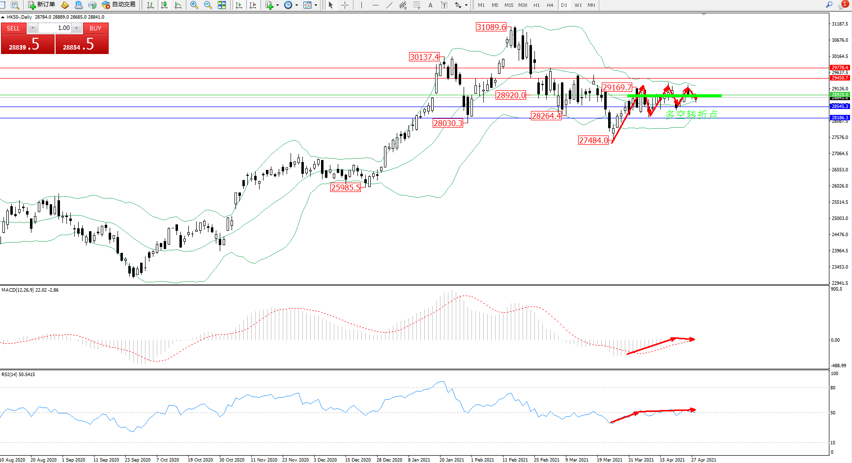 香港恒生指数4月28日(周三)收盘上涨129.8点,涨幅0.45%,报29071.34点;港股三大指数全天呈窄幅震荡,市场总体表现平稳。恒生科技指数涨0.19%报8532点。大型科技股涨跌参半,阿里巴巴、京东涨超2%,小米跌近4%,美团跌超1%;前期强势的铜业股、港口股全线回调,铜板块居市场跌幅首位,汽车股、餐饮股表现低迷。大市成交额萎缩至1362亿港元。南向资金今日净买入8.66亿港元,连续9日增持港股。香港交易所、药明生物、舜宇光学科技净买入额位列前三,分别获净买入6.64亿港元、5.55亿港元、2.57亿港元。净卖出前三个股为小米集团-W、腾讯控股、中国移动,分别遭净卖出6.98亿港元、4.78亿港元、1.93亿港元。市场已经消化调高印花税消息,港交所会配合政府工作,理解港府视为增加收入来源以及持份者对港股交投的担心,港交所会持续研究可在甚么地方增加交投活动。戴志坚称,港交所年内入股广州期货交易所是"突破性投资",成为首家内地交易所境外股东,除了股权投资外,也期望可在产品上也有合作,但广期所至今未有公布业务发展安排,不方便说更多。另外,在南向债券通未有额外补充,需要等内地有更多公布。港交所承认正研究SPAC上市机制,市传最快在6月底前咨询市场。
