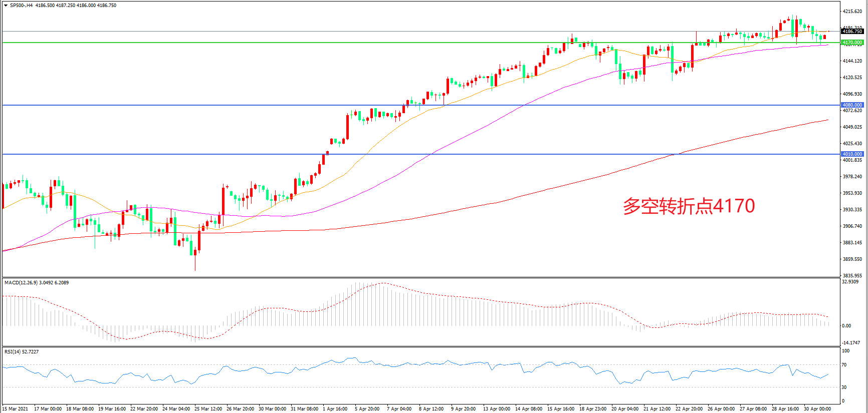 4小时图看,标普500跌突破4170后延续高位震荡,短线涨势有所放缓,55周期均线成为下方支撑,4170成为多空分水岭,MACD红柱缩短,RSI指标走平,日内延续震荡概率较大。