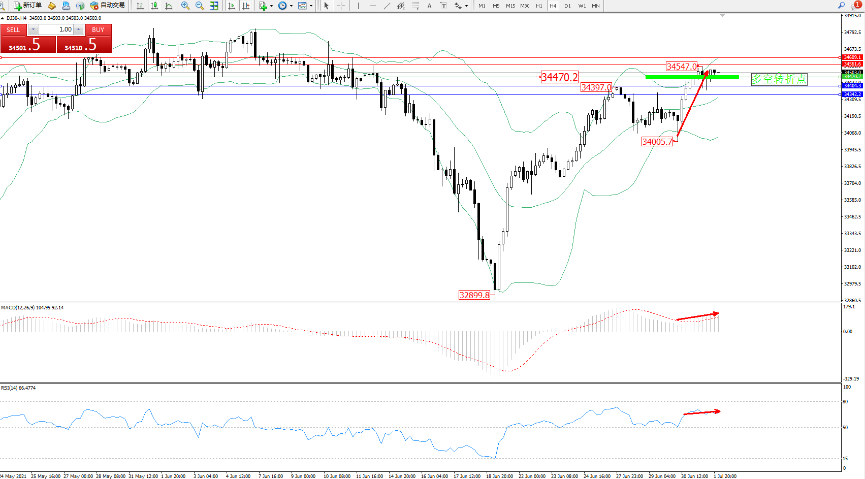 技术点评:多头动力延续布林带指标通道内持续震荡上扬,高位抵达34547位置后开始窄幅整理,布林带指标呈缓慢张口走势持续中,多头动力短期有遇阻迹象,MACD指标处于0轴线上方多头区域维持整理平移,RSI指标处于多头区域高位整理徘徊中;