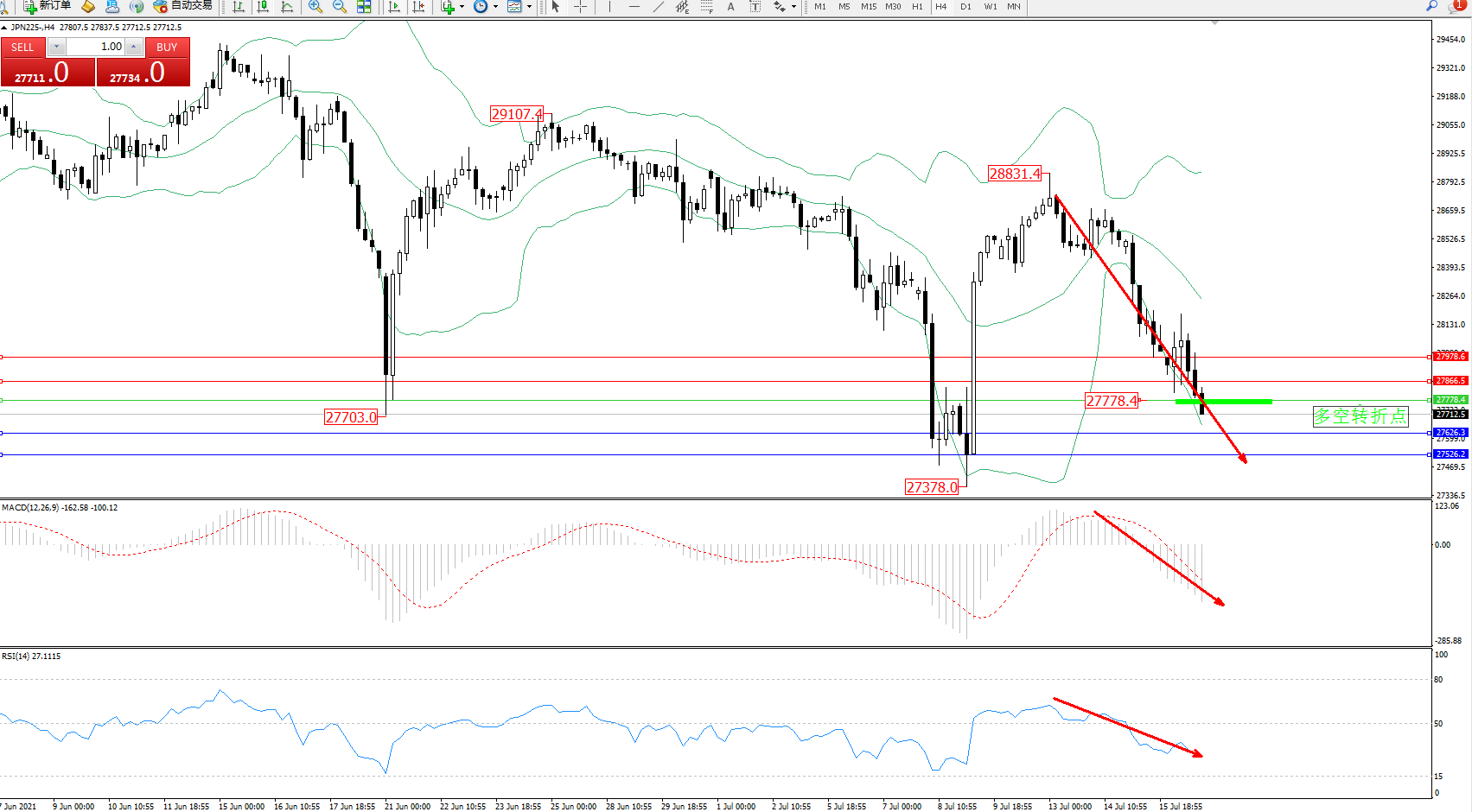 技术点评:空头动力延续布林带指标下轨附近节点持续下探,跌势未见止步迹象,布林带指标呈张口走势后开始收口向下移动中, 前期低位27378位置近在咫尺,有进一步试探破位态势,MACD指标处于0轴线下方空头区域维持震荡不断下移中,RSI指标处于50均衡线下方空头区域维持轴线不断下行中;