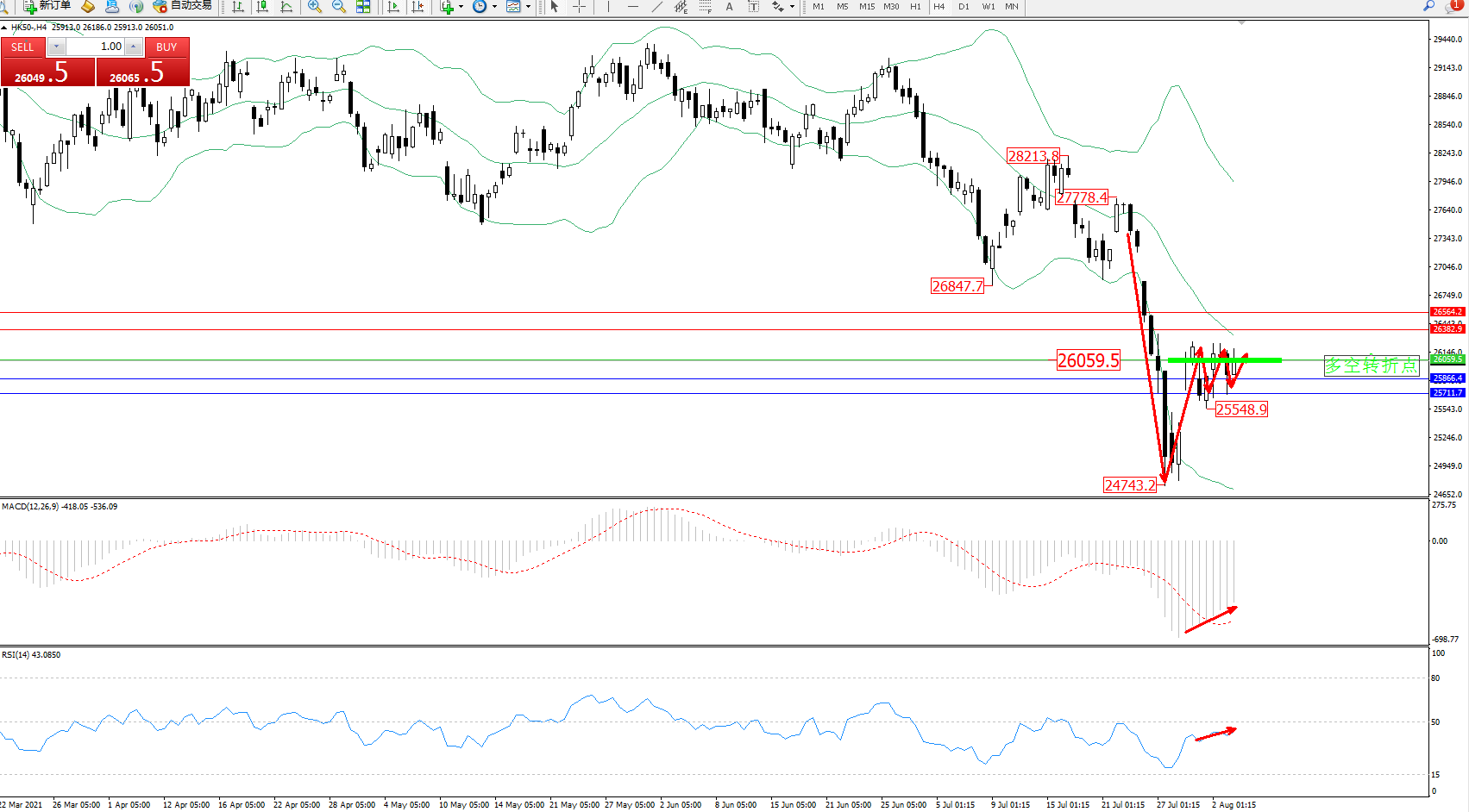 技术点评:空头动力延续布林带指标下轨持续下挫后,低位抵达24743位置得到支撑反转上移,维持窄幅整理平移中,多头动力有伺机入场态势,布林带指标呈收口走势持续中,MACD指标处于空头区域低位震荡缓慢上移,RSI指标维持空头区域窄幅整理;