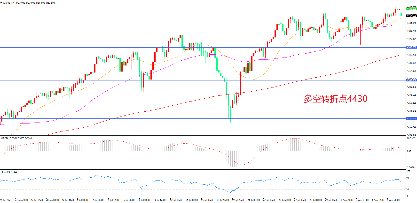 4小时图看,标普500以均线系统为支撑再度拉升,短期表现强势,55均线成为下方支撑,4430成为多空分水岭,MACD红柱增加,RSI指标走平,日内震荡上行概率较大。