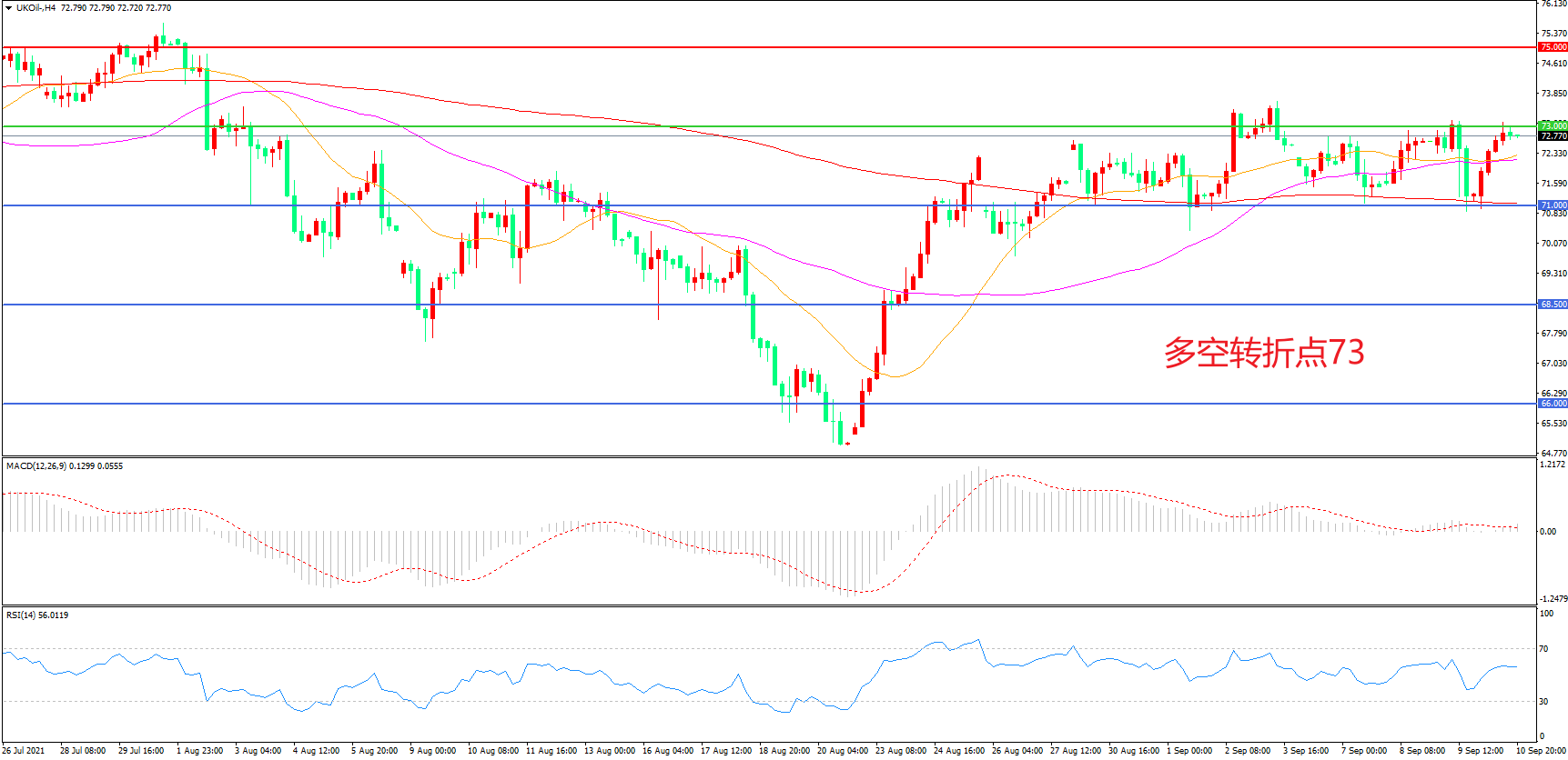 4小时图看,油价呈现区间震荡形态,71美元形成下方支撑,73美元成为上方阻力,MACD红柱缩短,RSI指标走平,日内延续宽幅震荡概率较大。