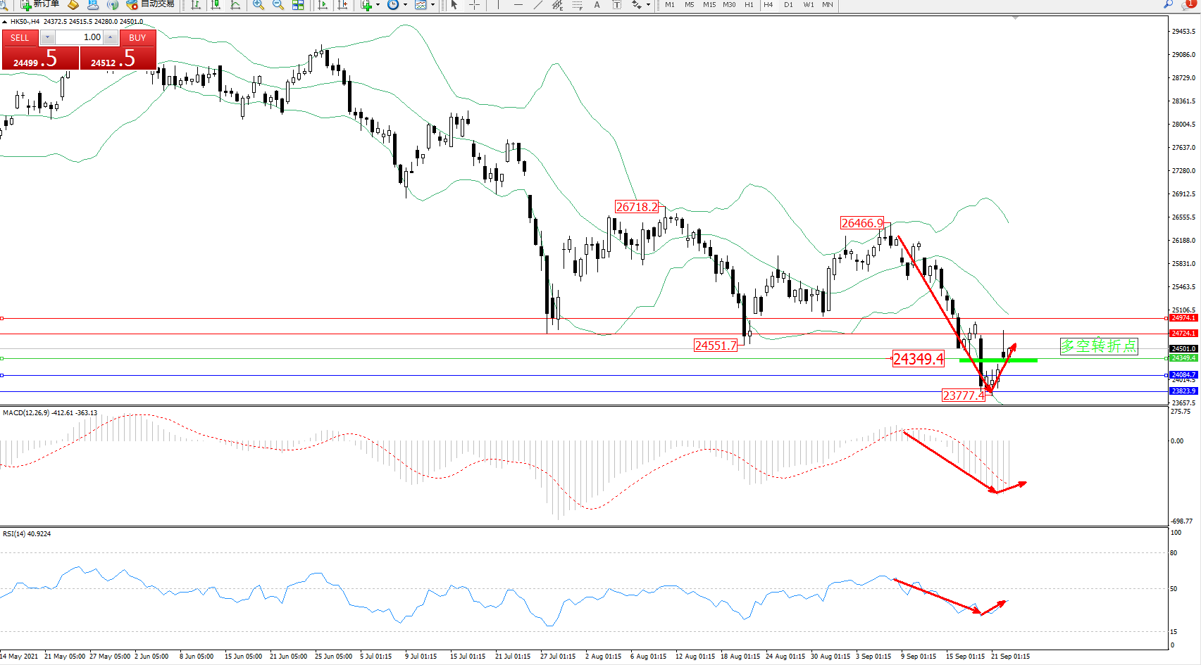 技术点评:空头动力延续布林带指标下轨附近持续震荡下探,低位抵达23777位置后得到支撑反转上移,短期有伺机多头动力上移迹象,布林带指标呈收口向下移动走势持续中,MACD指标处于空头区域低位震荡缓慢上移,RSI指标处于空头区域维持震荡后开始向上移动;
