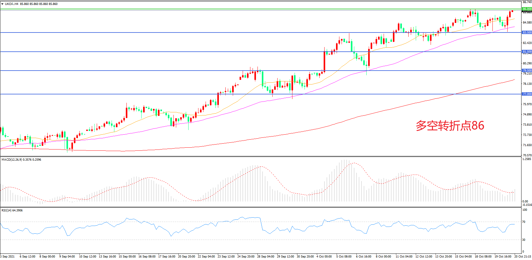 4小时图看,油价以21均线为依托,整体呈现上行形态,MACD红柱增加,RSI指标走平,日内延续上行概率较大。