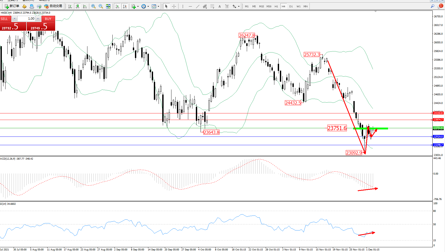 技术点评:空头动力延续布林带指标下轨附近持续震荡下行,低位抵达23092位置后得到支撑反转上移后震荡,多头动力有伺机入场态势,但高位空头动力强劲,短期或维持低位整理平移,布林带指标呈收口下行后开始有平移迹象,MACD指标处于空头区域维持整理平移,RSI指标处于空头区域低位有缓慢上移迹象;