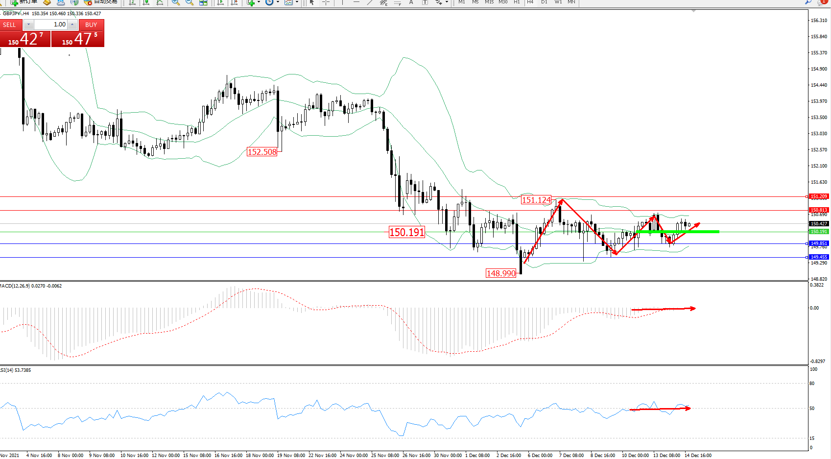 交易策略:150.191上方看涨,目标150.813、151.209