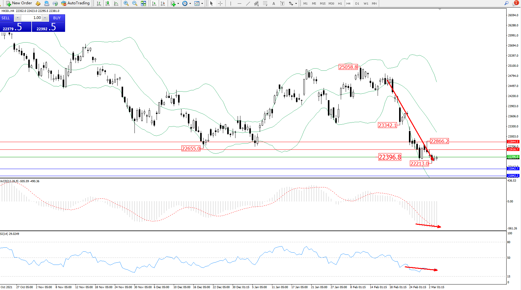 香港恒生指数3月3日(周四)收盘上涨123.42点,涨幅0.55%,报22467.34点;港股主要指数收盘涨跌不一,恒生科技指数跌1.16%,下破5000点大关再创新低价。大型科技股科技股涨跌各异,机构称俄乌战事或将刺激航运运价上行,海运股持续走强,受益燃油附加费上调,航空股上扬明显。香港本地银行股集体上涨,其中,渣打集团涨4.3%,汇丰控股和中银香港涨超3%,大新银行和东亚银行涨超1%,恒生银行涨0.21%。美联储主席鲍威尔昨晚称:在3月份将利率提高25个基点仍然是合适的;如果通胀持续火爆,美联储可能会在某次会议上加息50个基点。