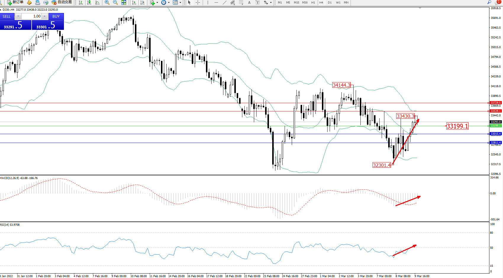 道琼斯指数3月9日(周三)收盘上涨652.72点,涨幅2.00%,报33285.36点;美国禁止从俄罗斯进口石油。英国表示,将在2022年底前逐步停止进口俄罗斯石油和石油产品。自俄罗斯入侵乌克兰以来,美国的一年期通胀预期飙升——预计明年消费者价格上涨速度将从2月1日的3.5%升至3月7日的5.24%。预计未来10年和6年的通胀率在本周一分别达到2.43%和2.73%,也明显高于美联储设定的2%目标。如果长期预期继续上升,这将表明市场对美联储控制通胀的能力失去信心,如果不加快升息步伐,通胀上升势头愈发难以遏制。