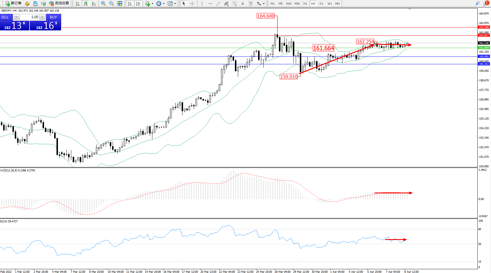 技术点评:多头动力延续布林带指标通道中上轨区间持续震荡上扬,高位抵达162.254附近节点开始整理平移,短期多头动力或将继续向上拉升,布林带指标呈收口走势持续平移中,MACD指标处于0轴线上方弱势徘徊中,RSI指标处于50均衡线上側窄幅整理中;