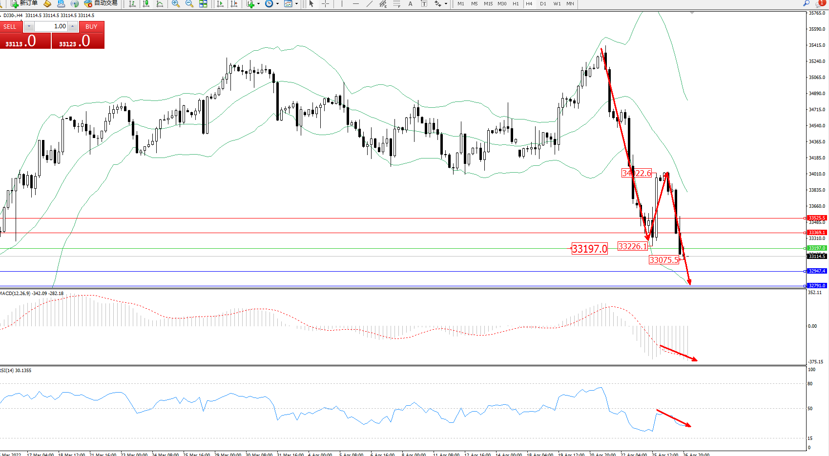 道琼斯指数4月26日(周二)收盘下跌777.93点,跌幅2.28%,报33271.53点;美股收盘,道指初步收跌约800点,美股跌势在盘后交易中延续,因Alphabet、德州仪器和微软等公司的业绩令人失望。这些公司的财报数据提供了美联储三年来首次收紧政策对美国企业影响的最新线索。纽约人寿投资公司的经济学家兼投资组合策略师Lauren Goodwin表示,“毫无疑问,经济增长陷入困境,随着工资和通胀上升,美联储实现软着陆的可能性正在变小。资产配置的大问题不是通胀是否会很高。这是当然的。问题是增长是否可以跟上。”